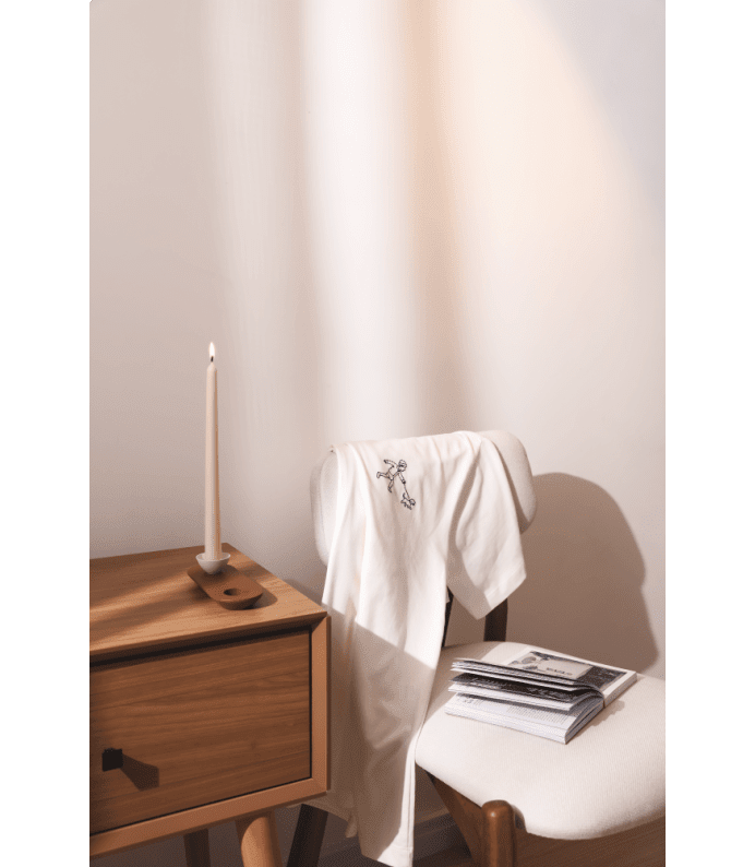 Confeccionada em 100% algodão, com toque macio e caimento confortável, ela traz um bordado delicado no peito, um pequeno personagem que carrega narrativa, memória e imaginação. Um desenho sutil, quase um segredo, que se revela aos poucos e cria conexão com quem observa.