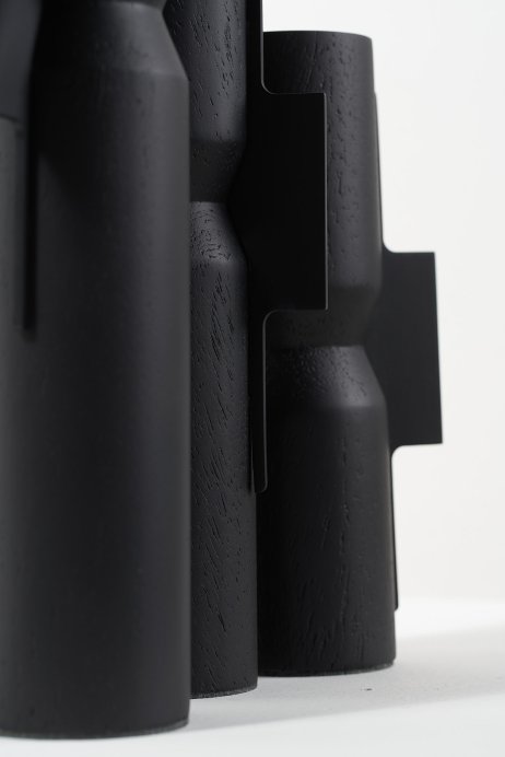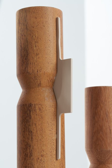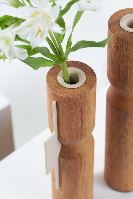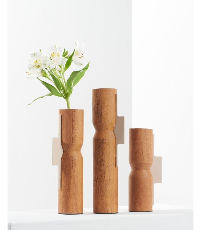 A Coleção DPT008 aposta em formas verticais e proporções equilibradas. Os vasos esculpidos em madeira angelim recebem um detalhe metálico que marca o ponto focal da peça. Disponível em diferentes alturas, a coleção permite composições dinâmicas e modulares, funcionando bem em conjuntos ou individualmente