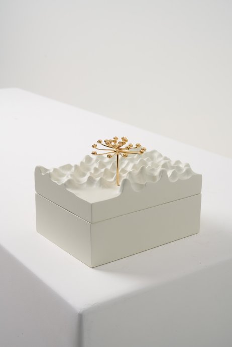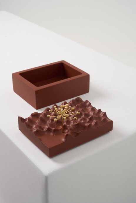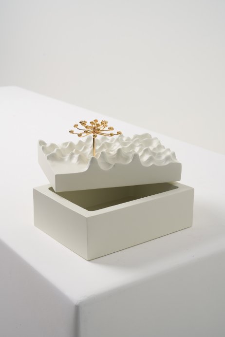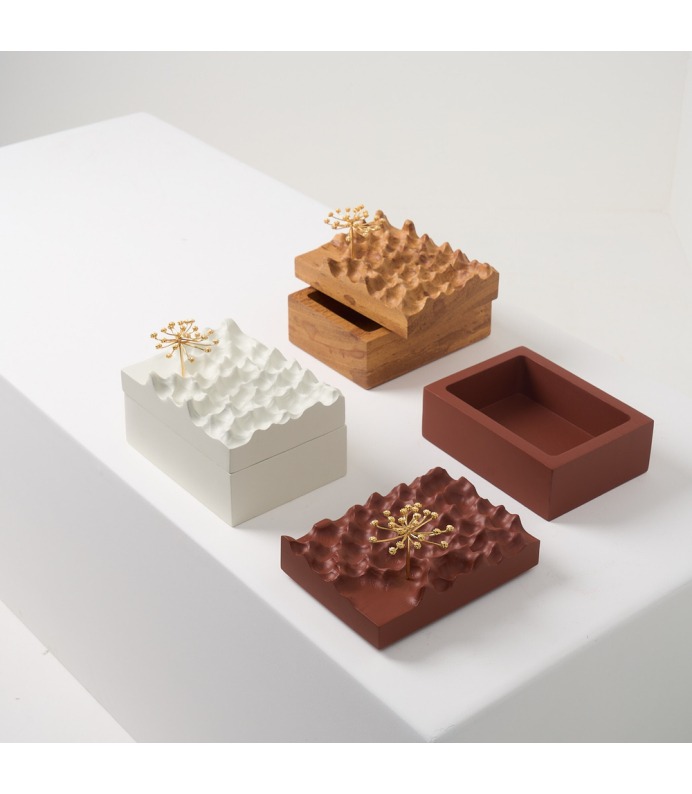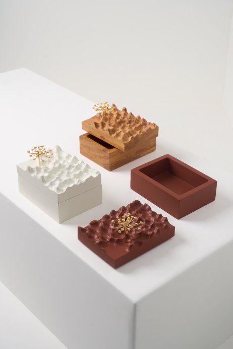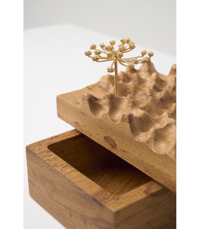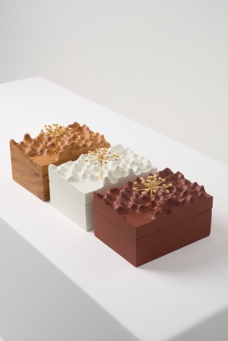 A Coleção DPT014 cruza arte e função. As esculturas, produzidas em madeira maciça com detalhes em bronze banhado a ouro, aparecem em versões de mesa, parede, caixa, palha e cabideiro. São peças que podem atuar como objetos decorativos ou funcionais, sempre com forte identidade gráfica e acabamento refinado