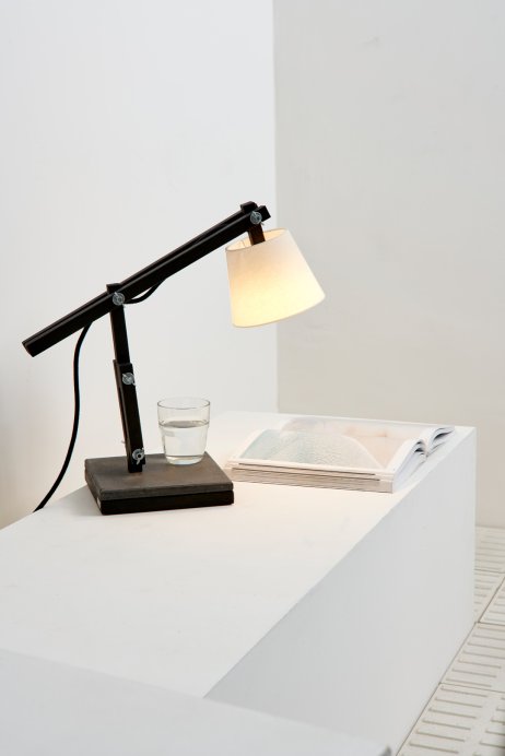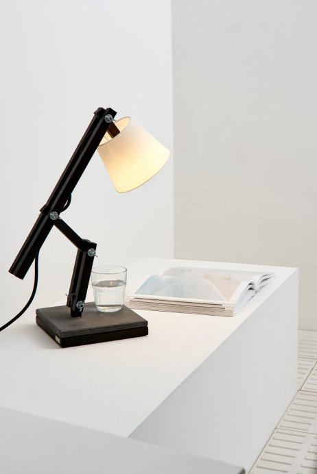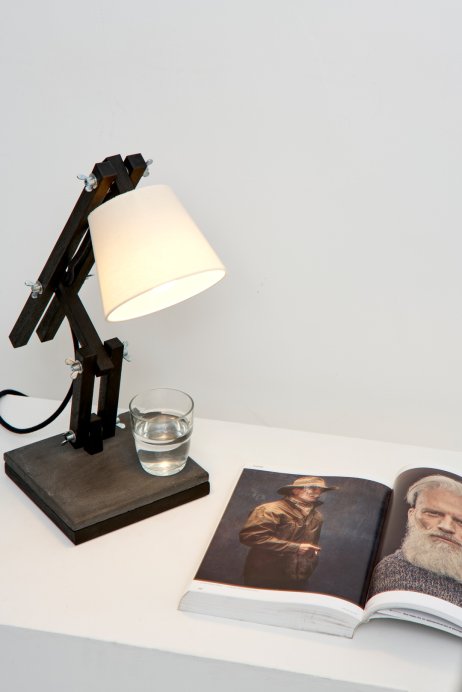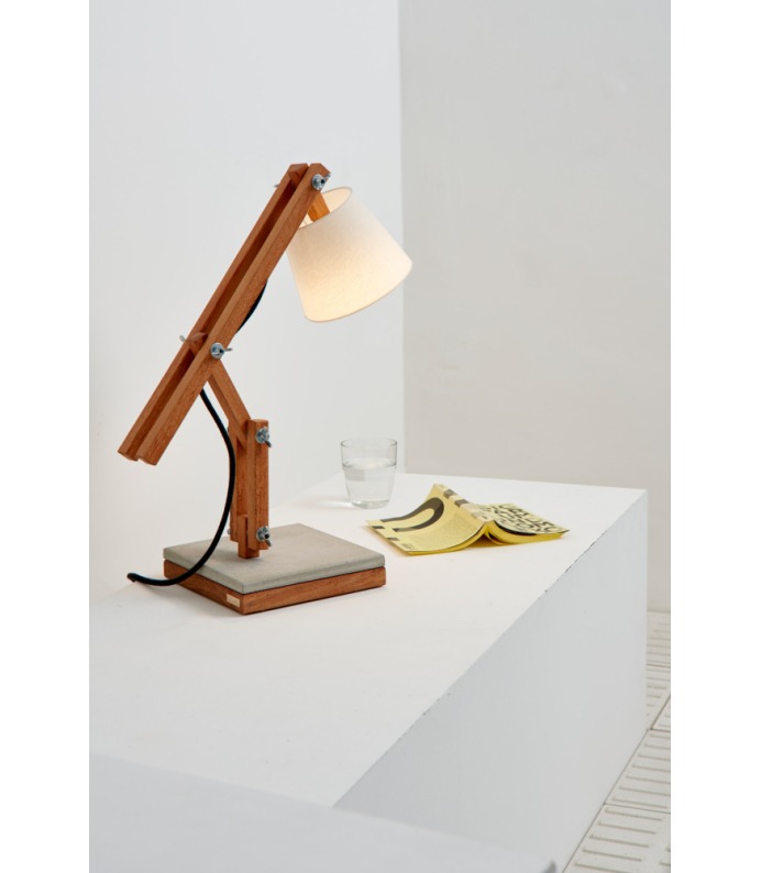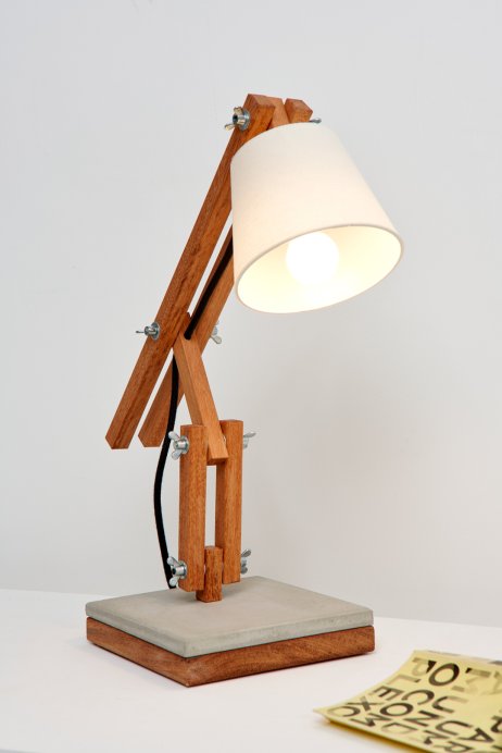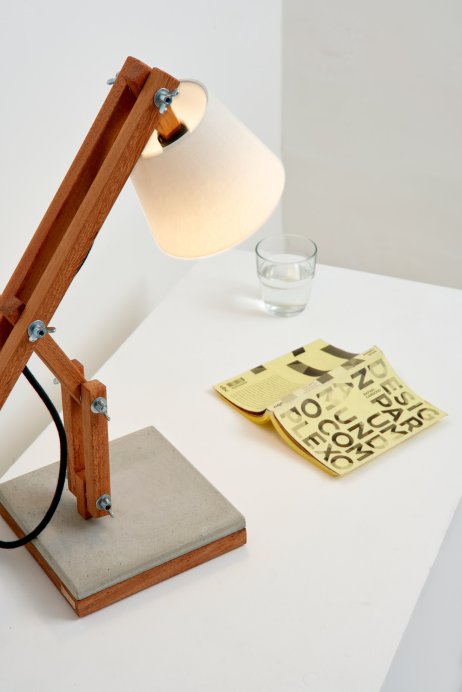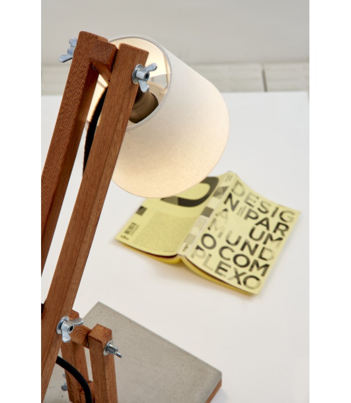 Madeira e concreto combinam-se em uma luminária de mesa articulada e regulável, fabricada artesanalmente com madeira de reflorestamento. Com cúpula de algodão cru e base em concreto – que serve de apoio para canecas quentes ou úmidas –, a Muda é uma luminária de design jovem, que muda com você, seu astral e seu ambiente.