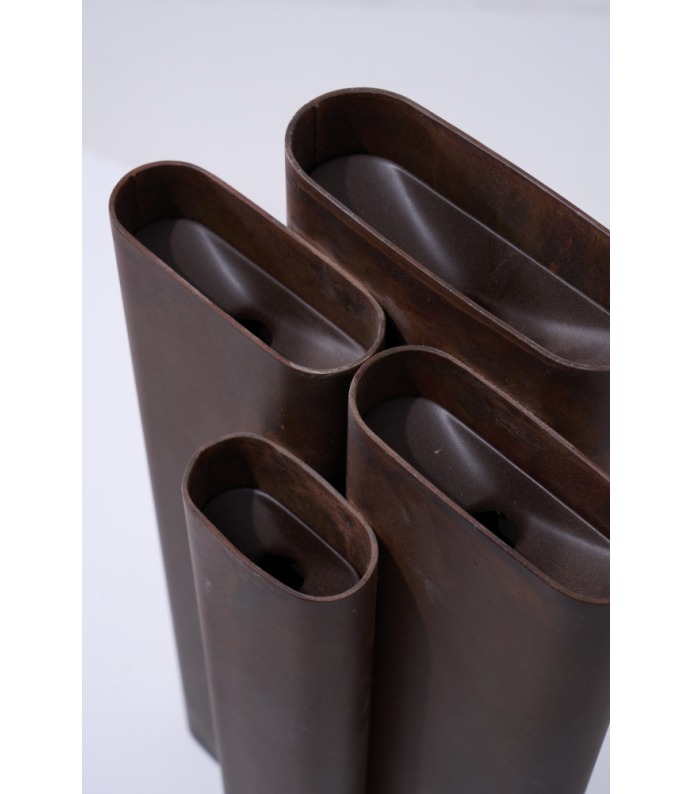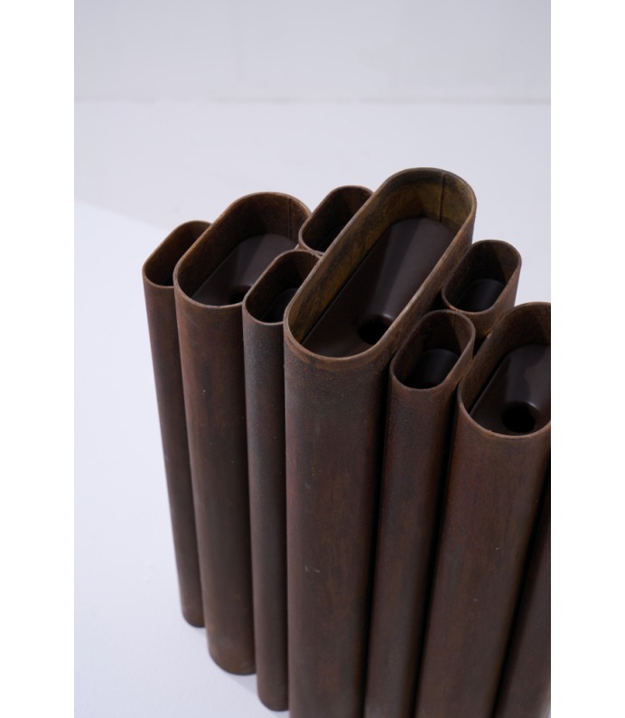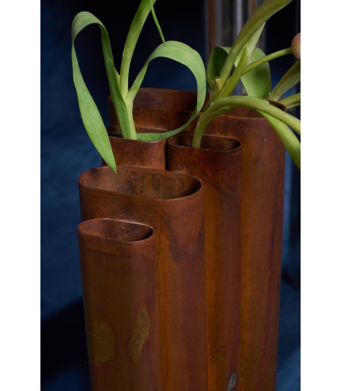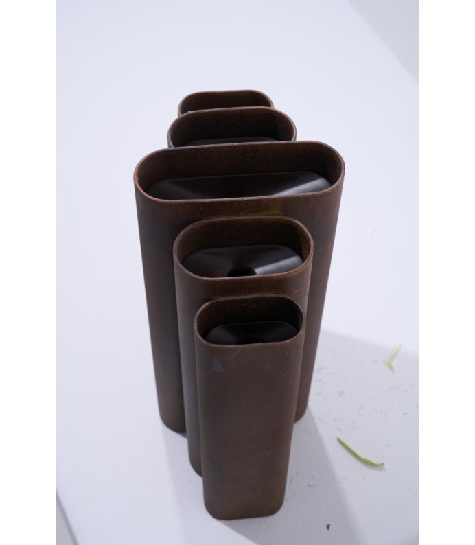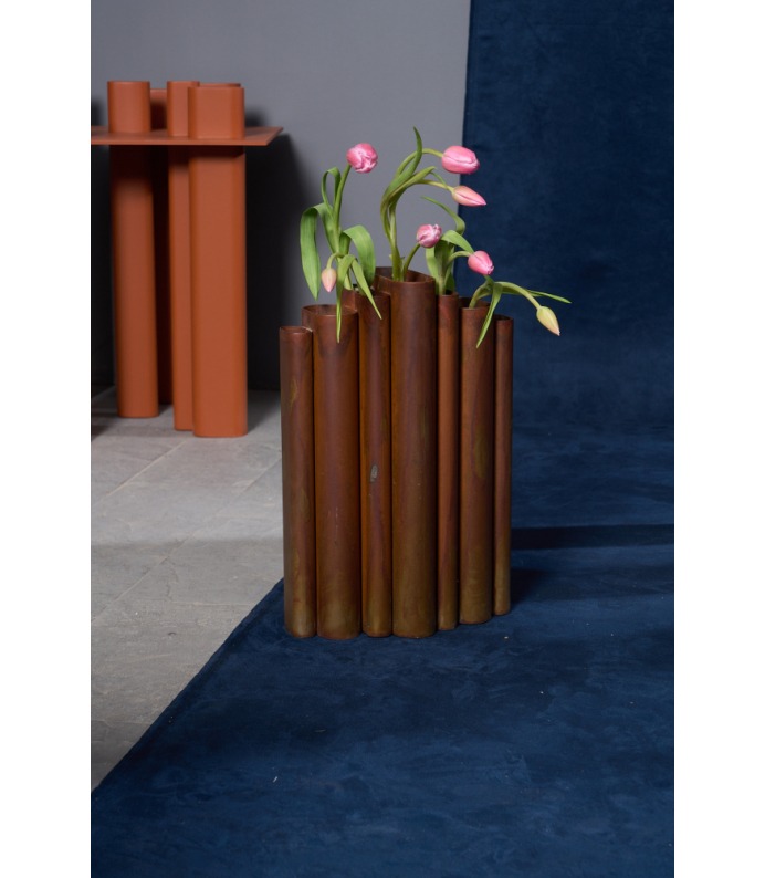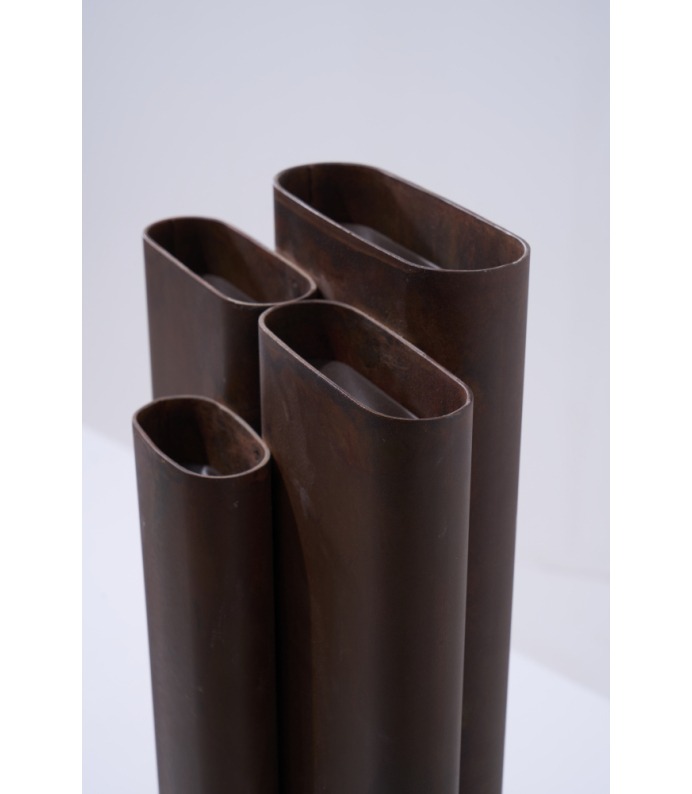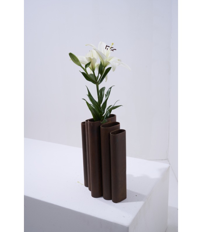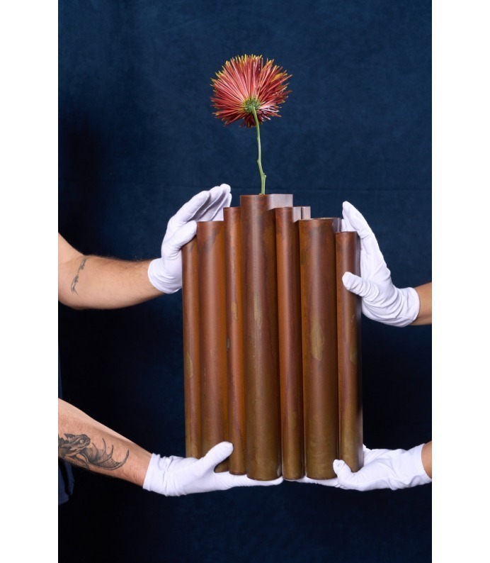 Os Vasos Vera exploram a verticalidade e o ritmo. Tubos metálicos se organizam em composições que remetem à arquitetura e à repetição estrutural. São peças que se impõem pelo peso visual e pela honestidade da matéria, criando contrastes potentes com a delicadeza dos arranjos que acolhem