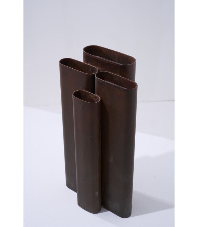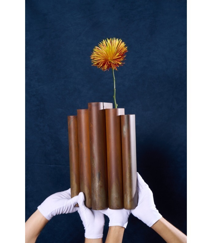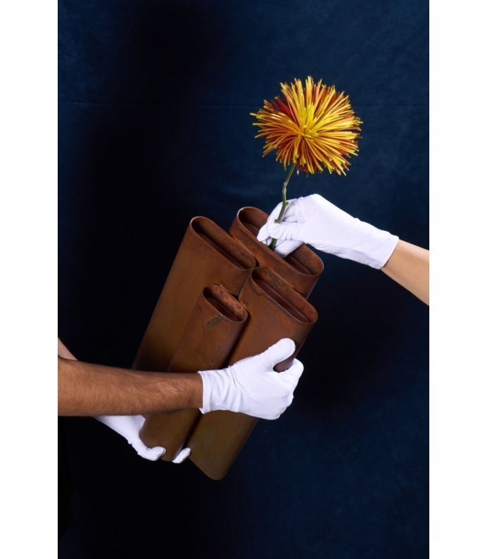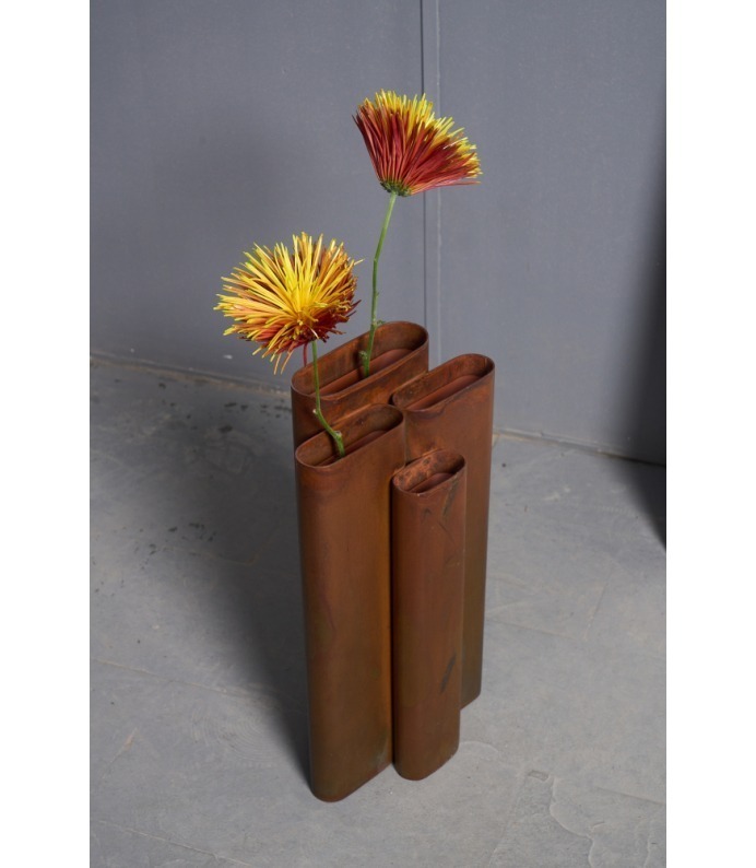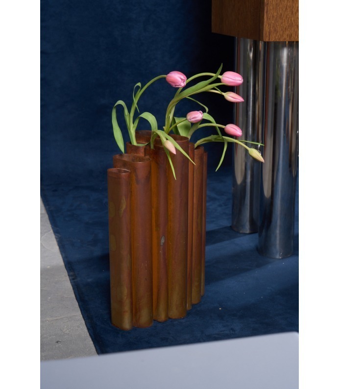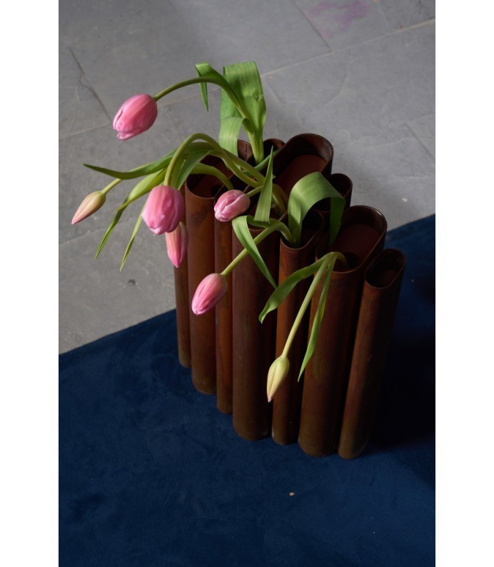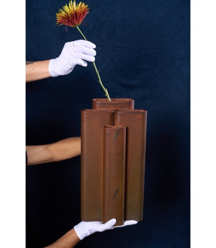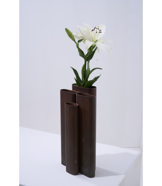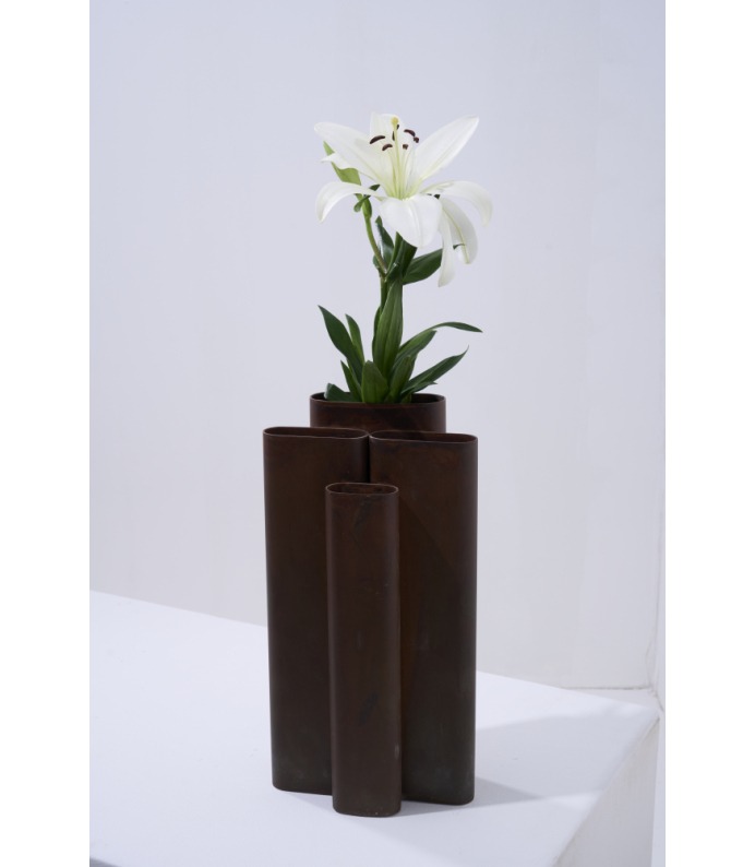 Os Vasos Vera exploram a verticalidade e o ritmo. Tubos metálicos se organizam em composições que remetem à arquitetura e à repetição estrutural. São peças que se impõem pelo peso visual e pela honestidade da matéria, criando contrastes potentes com a delicadeza dos arranjos que acolhem